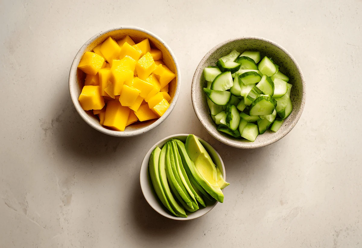 Start by dicing your mango, cucumber, and avocado. Then, place them in a large bowl and add your lime juice, plus half the olive oil. Season with salt and pepper, before mixing well. Then, cut your halloumi into even slices and set aside.