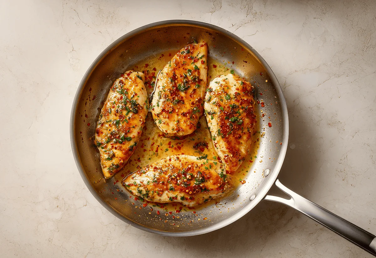 Next, butterfly your chicken breasts and place them into another bowl. In the same bowl, add your chilli flakes, garlic paste, parsley, and lemon juice. Season with salt and pepper then mix thoroughly and set aside to marinate.