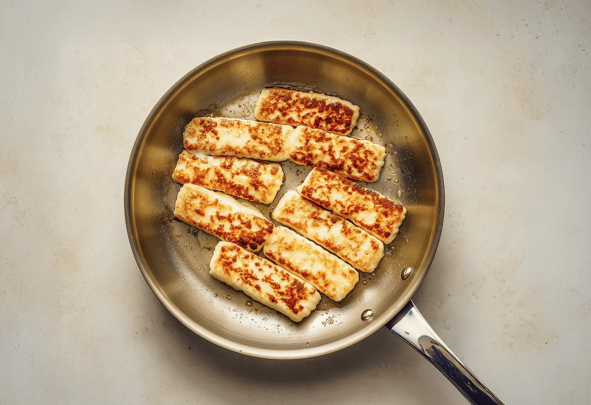 Meanwhile in the same pan, add your halloumi and cook for 2-3 mins each side until golden brown. Then, transfer to a chopping board and dice into chunks.