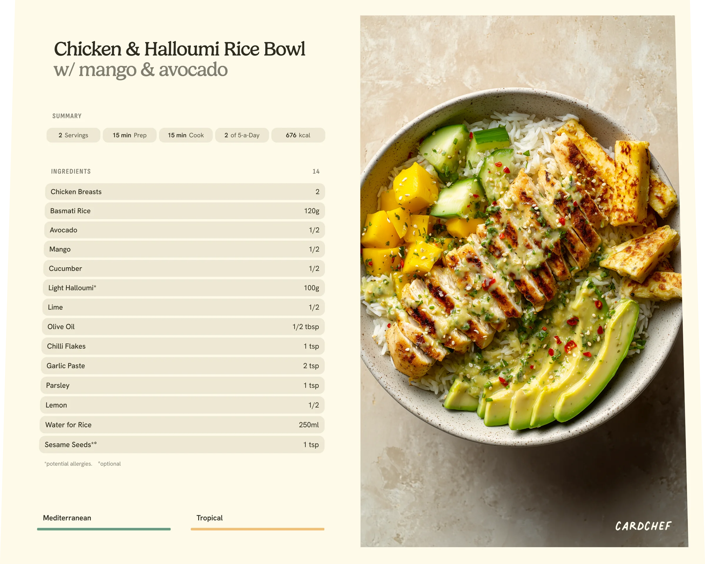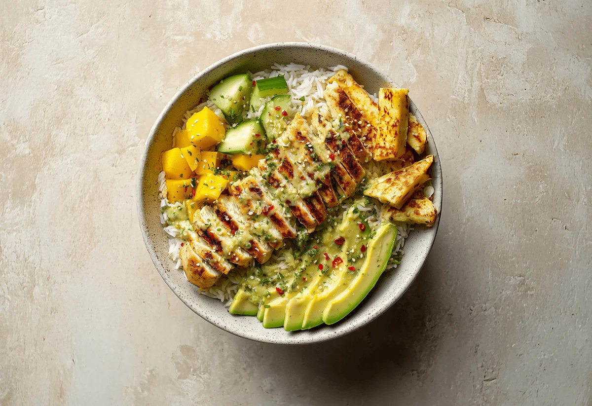 Finally, divide your rice into bowls. Top one side with the mango, cucumber, and avocado mixture. Then, slice up your cooked chicken and place it on the other side. Finish by adding your halloumi, and garnishing with sesame seeds (optional).