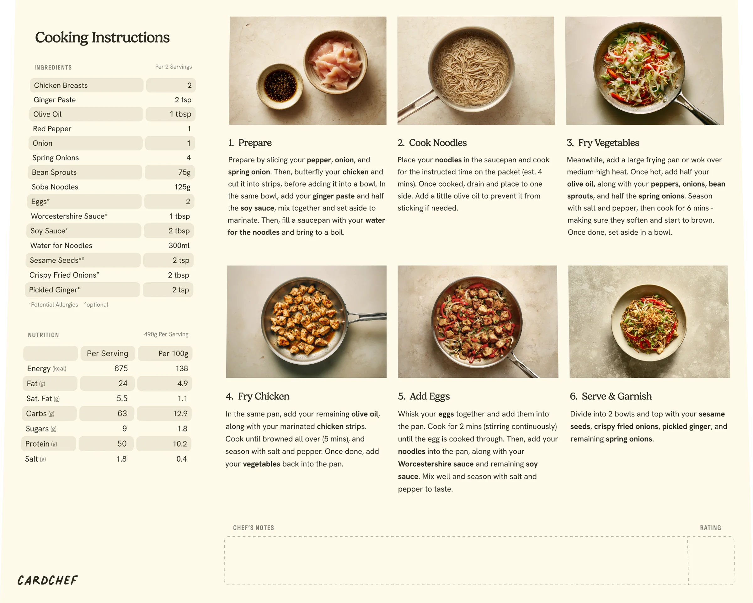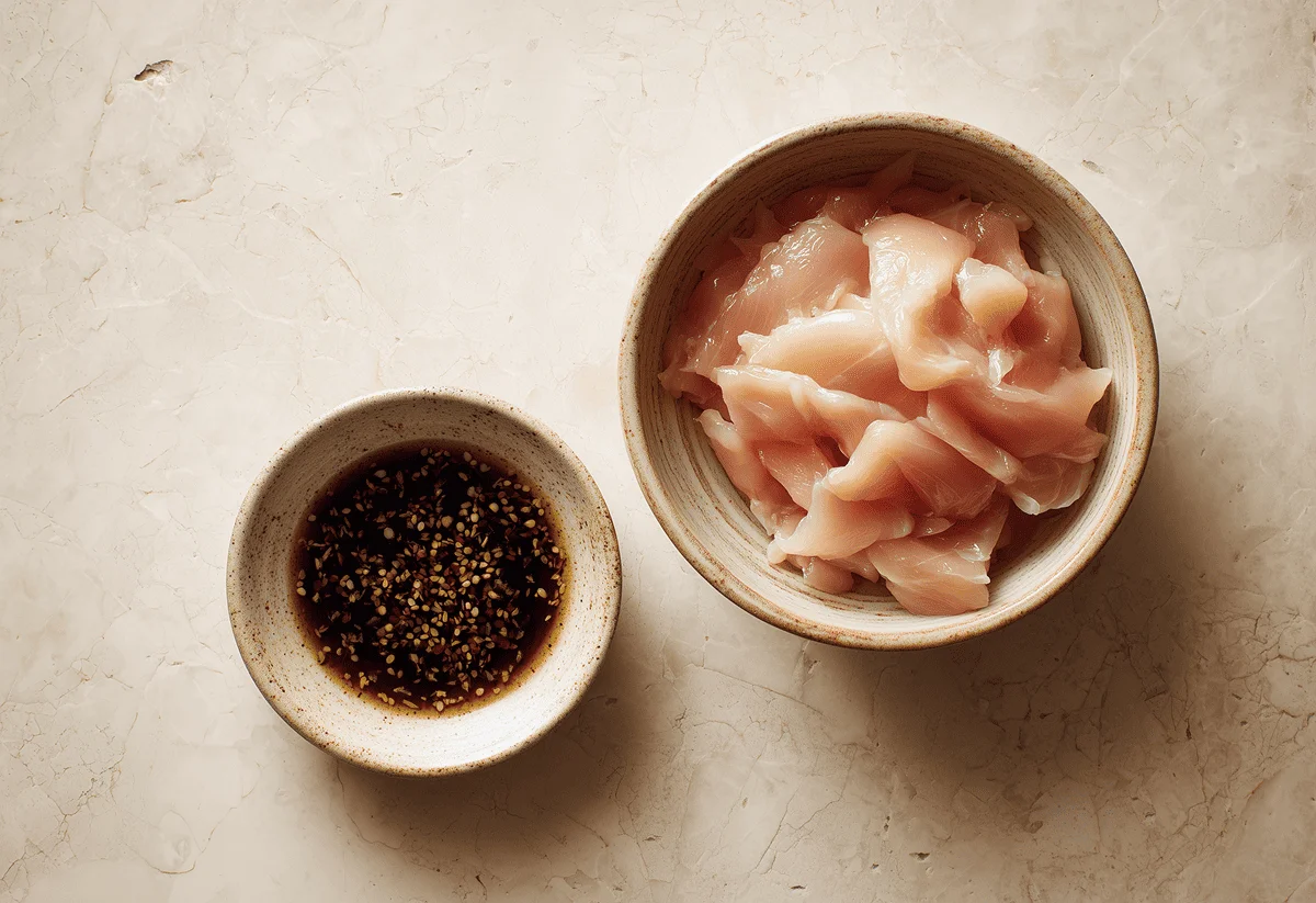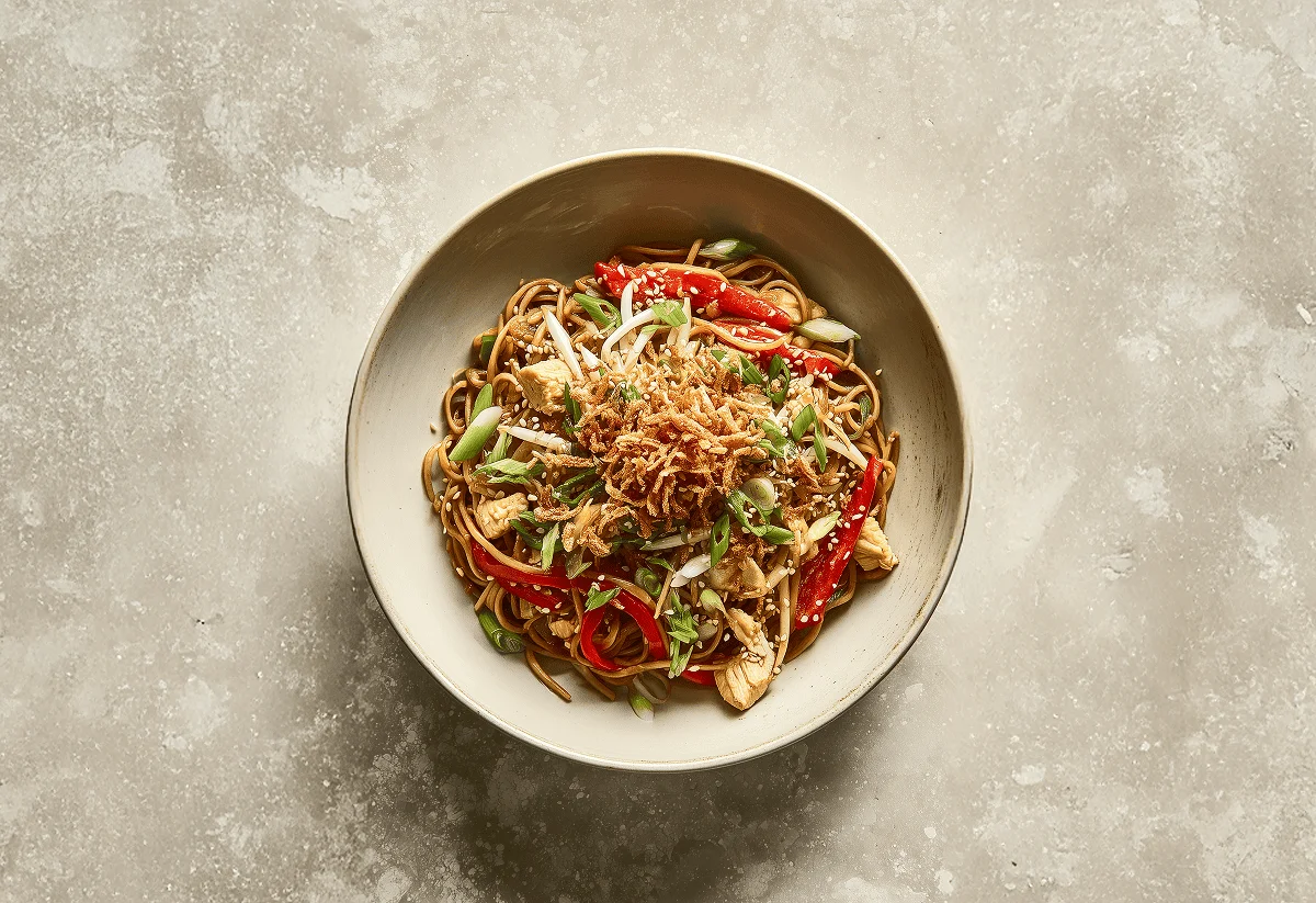 Prepare by slicing your pepper, onion, and spring onion. Then, butterfly your chicken and cut it into strips, before adding it into a bowl. In the same bowl, add your ginger paste and half the soy sauce, mix together and set aside to marinate. Then, fill a saucepan with your water for the noodles and bring to a boil.