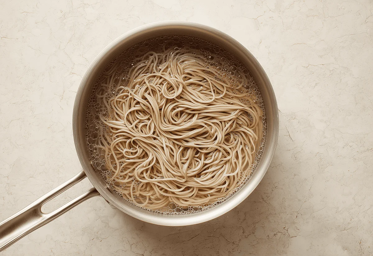 Place your noodles in the saucepan and cook for the instructed time on the packet (est. 4 mins). Once cooked, drain and place to one side. Add a little olive oil to prevent it from sticking if needed.
