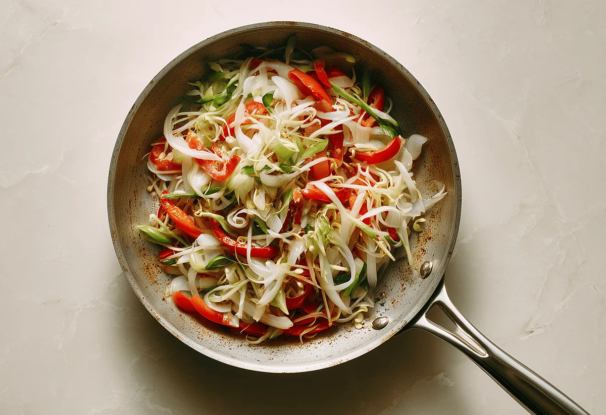 Meanwhile, add a large frying pan or wok over medium-high heat. Once hot, add half your olive oil, along with your peppers, onions, bean sprouts, and half the spring onions. Season with salt and pepper, then cook for 6 mins - making sure they soften and start to brown. Once done, set aside in a bowl.