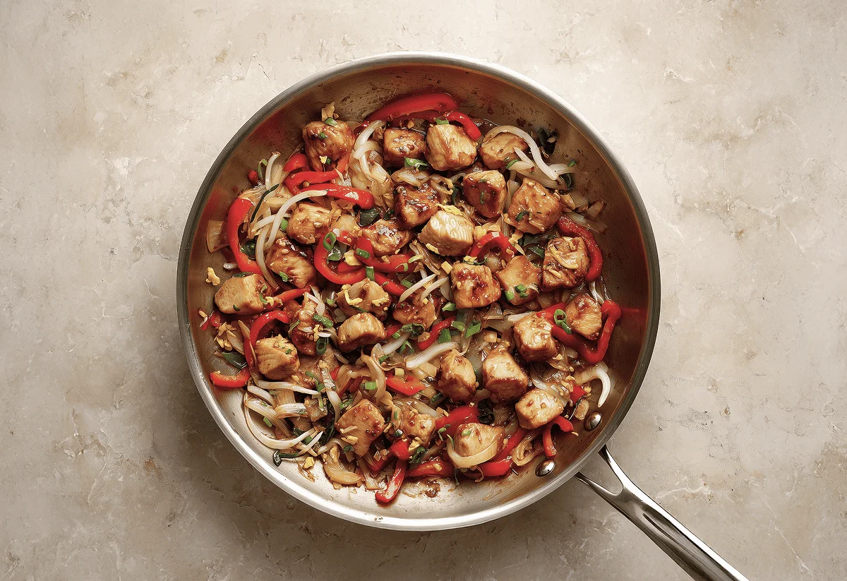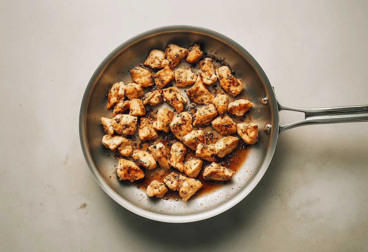 In the same pan, add your remaining olive oil, along with your marinated chicken strips. Cook until browned all over (5 mins), and season with salt and pepper. Once done, add your vegetables back into the pan.