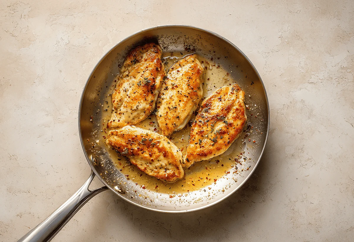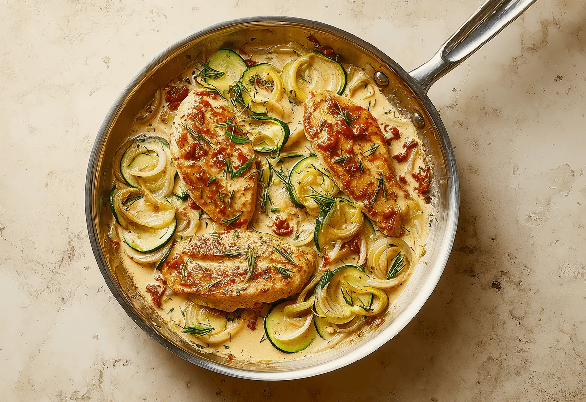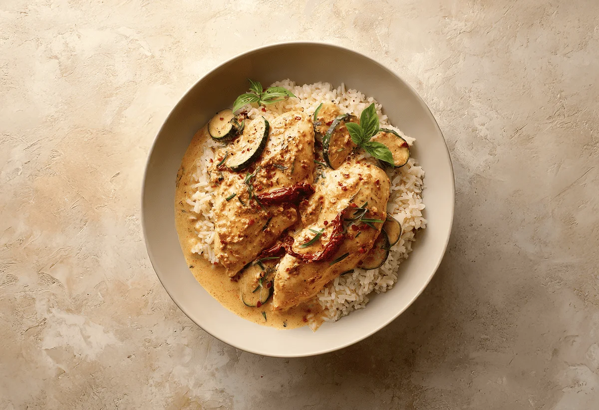 Lower the heat to medium-low and mix in the single cream. Simmer for 2 mins, then add the cooked chicken back in, along with any juices that collected. Coat the chicken with the sauce and let it simmer for another 2 mins.