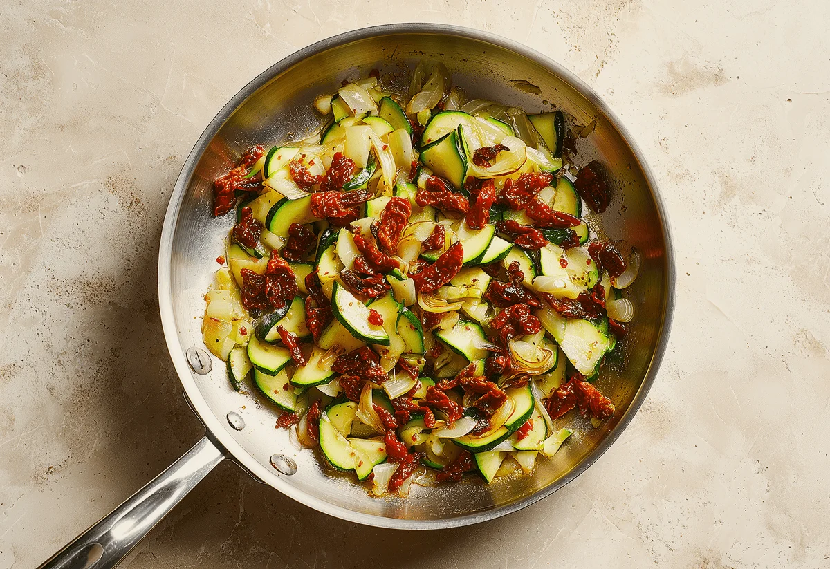 In the same pan, add the remaining sun-dried tomato oil, courgettes, and shallots. Cook for 6 mins until browned. Then, pour in the white wine (optional) and scrape off any browned bits from the pan whilst the liquid evaporates (2 mins). Then, add the sun-dried tomatoes and cook for a further 2 mins.