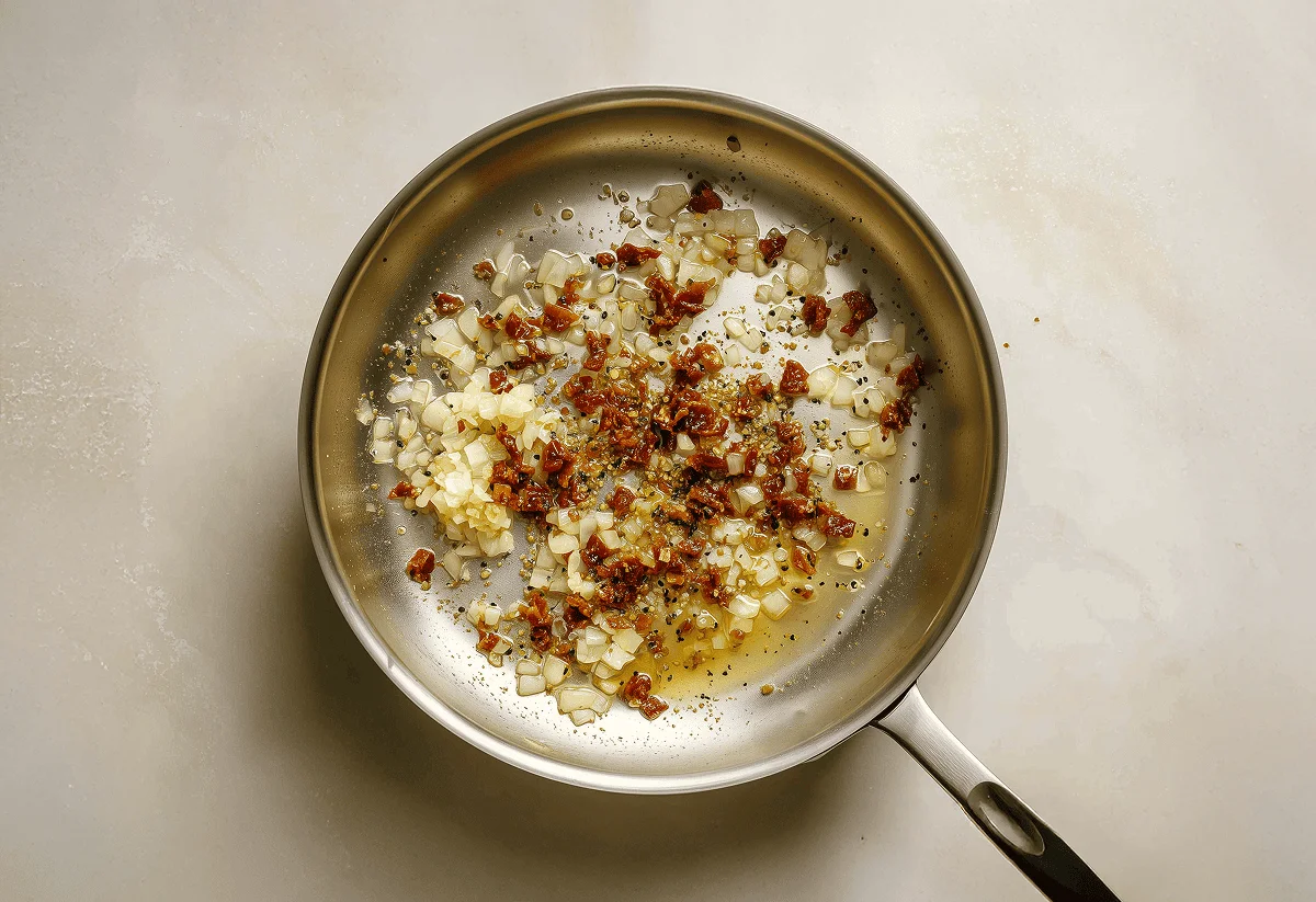 In the same pan, lower to medium heat and add your butter, followed by your garlic and onion. Season with salt and pepper, and cook for 3 mins. Then, add in your remaining sun-dried tomatoes, remaining Italian seasoning, smoked paprika, and nutmeg. Cook for further 1 min.