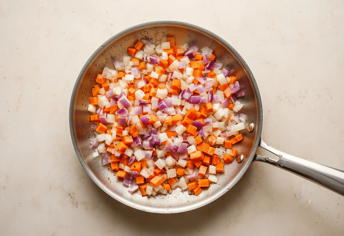 Meanwhile, heat a pan over medium-high. Once hot, add half your olive oil, then add your carrots, onion, and red onion. Season with salt and pepper, and fry for 8 mins. Once cooked, place to one side in a bowl.