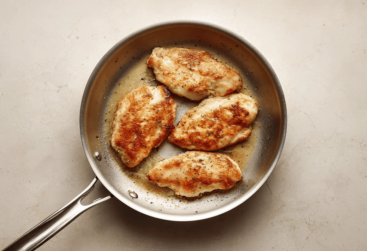 In the same pan, add the remaining olive oil. Then, add your marinated chicken, season with salt and pepper, and cook for 6 mins (browned all over and cooked through).