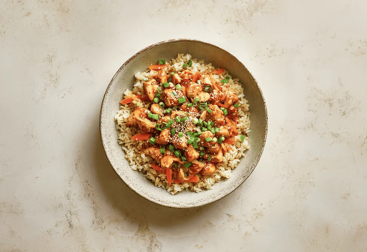 Once cooked, add the cooked vegetables and rice back into the pan. Glaze with your honey garlic sauce, and half of your spring onions. Cook for a further 2 mins, whilst mixing to combine. Serve into bowls and garnish with sesame seeds and the remaining spring onions.