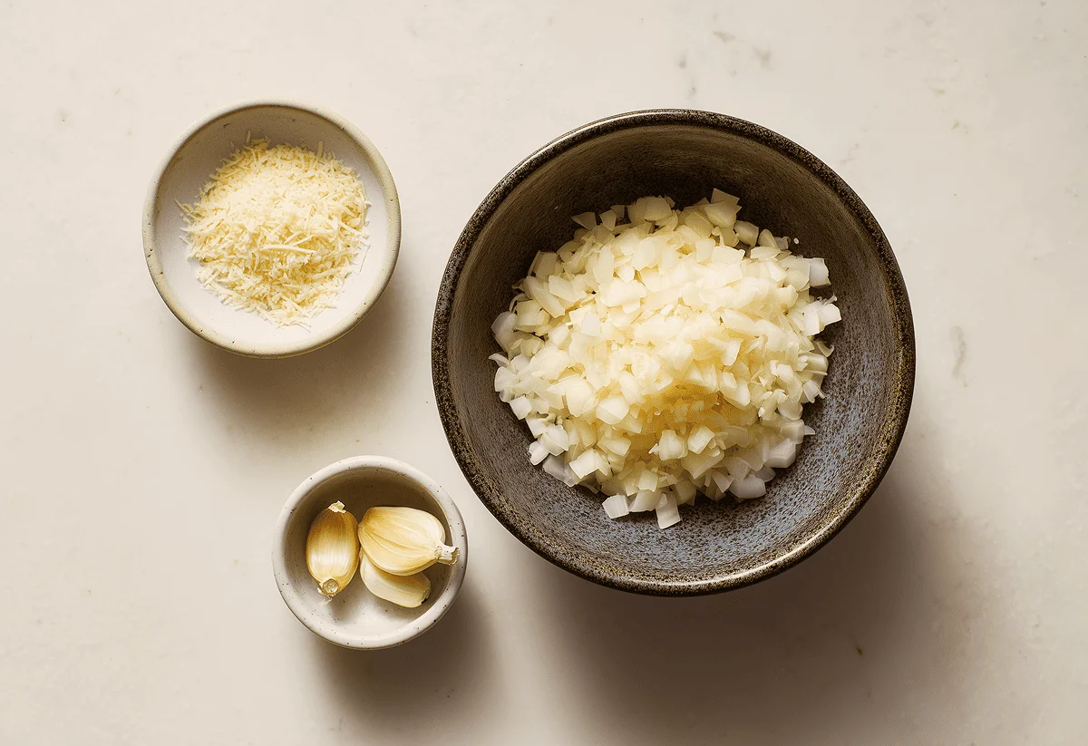 To start, dice your onion, gate your garlic and parmesan, and trim your tenderstem broccoli. Then, butterfly your chicken breasts and coat them in the flour.