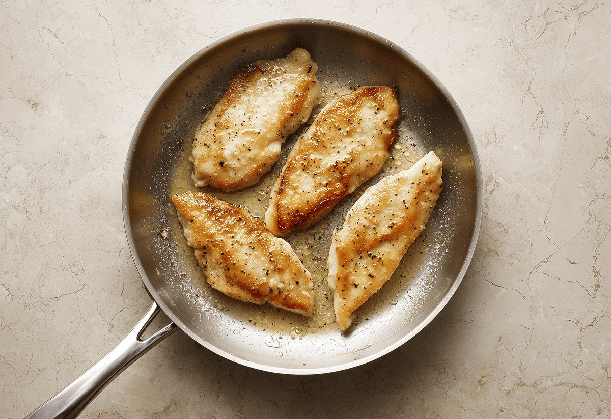 Put a on pan medium-high heat, add 10g of your butter, then add the chicken breasts and season with salt and pepper. Cook for 6 mins, turning half way through. Then, place them on a plate and set to one side.