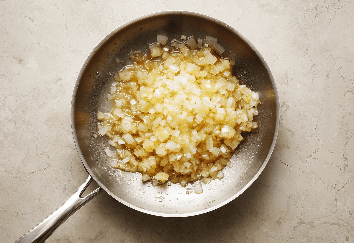 In the same pan, add your onion and cook for 4 mins. Then add your garlic and cook for 1 min. Lower to medium and add your chicken stock paste, water for stock, and coconut cream. Mix and simmer for 2 mins. Meanwhile, boil your tenderstem broccoli for 5 mins, then drain, add the remaining butter, and set aside.