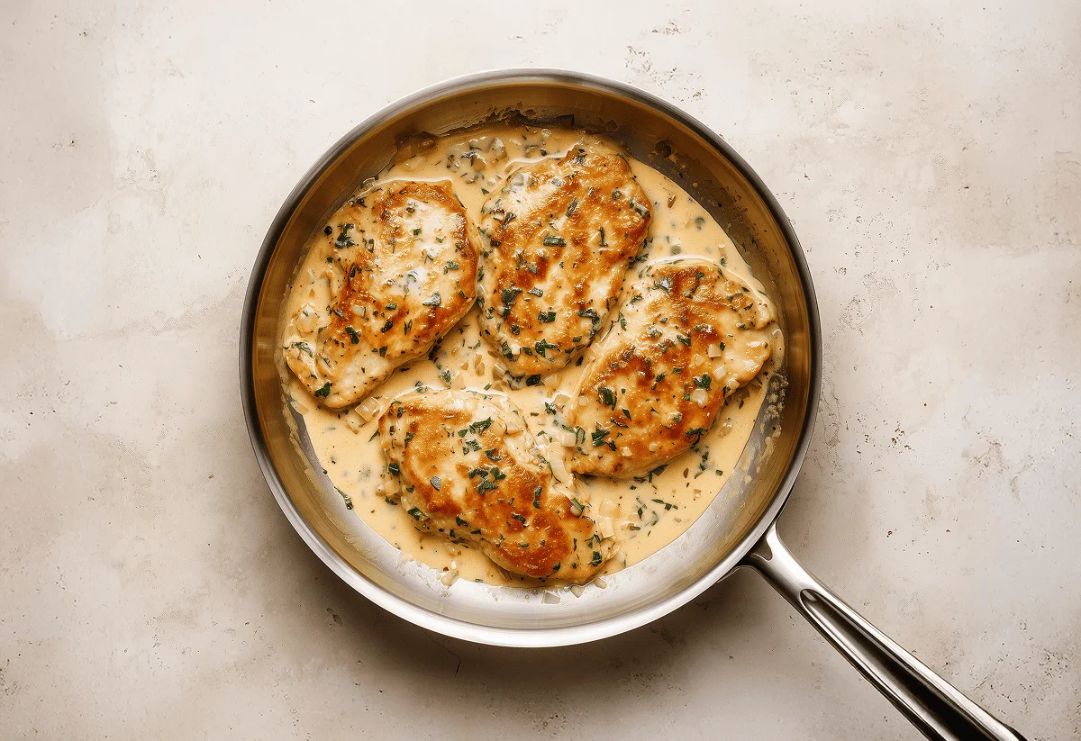 Meanwhile, add your herbs to the sauce, including dried thyme and oregano, as well as your sun-dried tomato paste. Then, give it a mix and add your chicken back into the pan. Simmer for 4 mins, letting the sauce thicken and the chicken cook through.