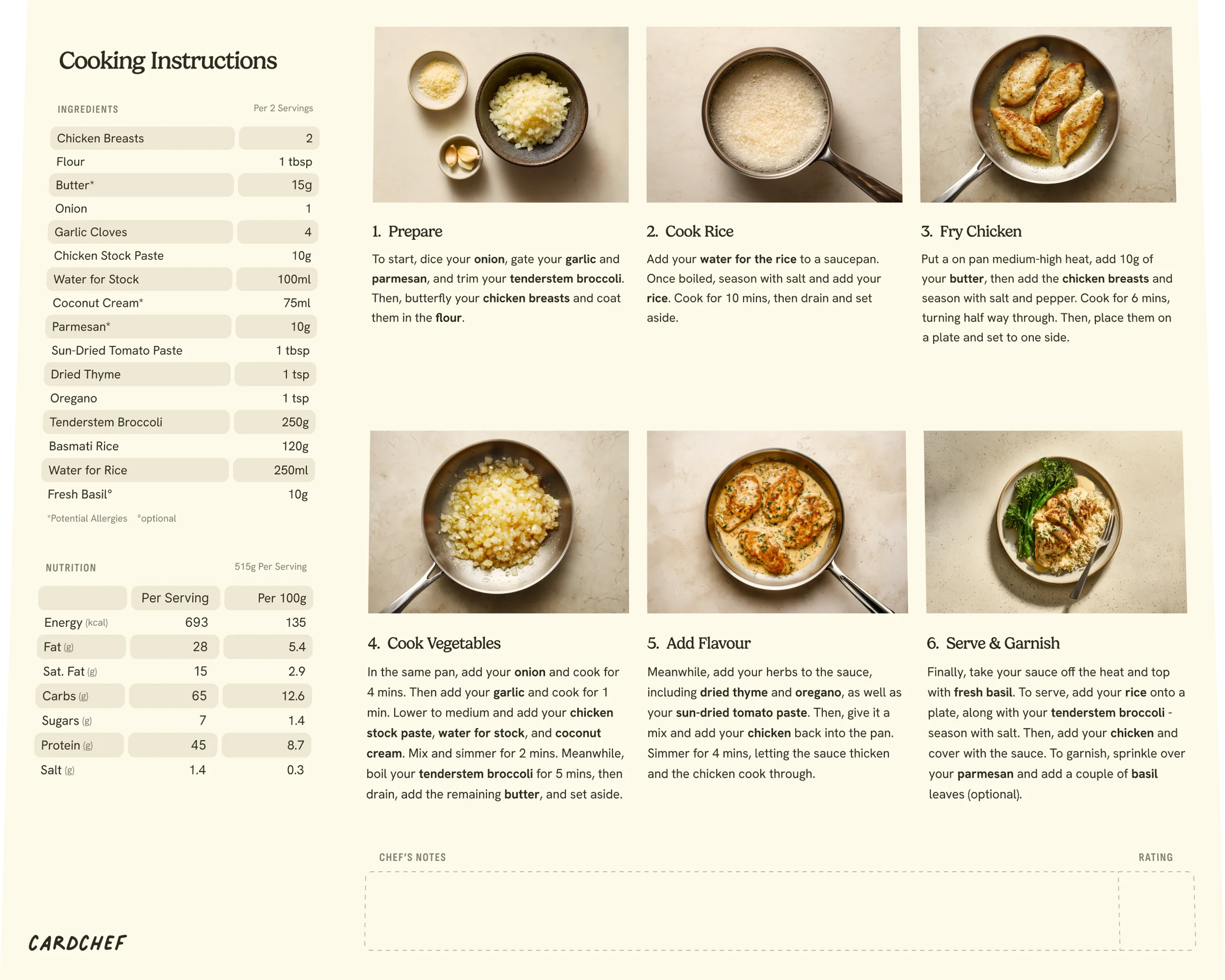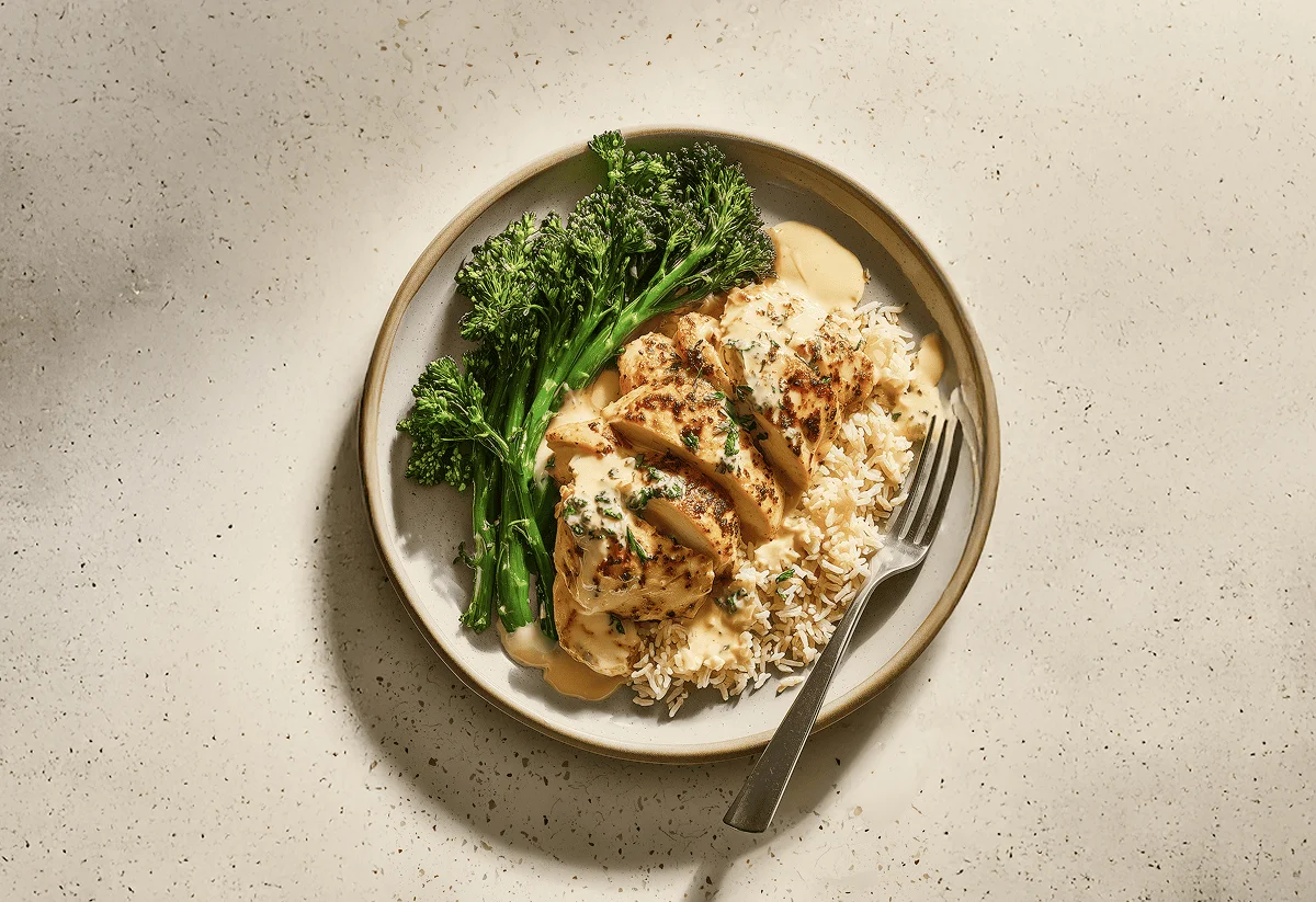 Finally, take your sauce off the heat and top with fresh basil. To serve, add your rice onto a plate, along with your tenderstem broccoli - season with salt. Then, add your chicken and cover with the sauce. To garnish, sprinkle over your parmesan and add a couple of basil leaves (optional).